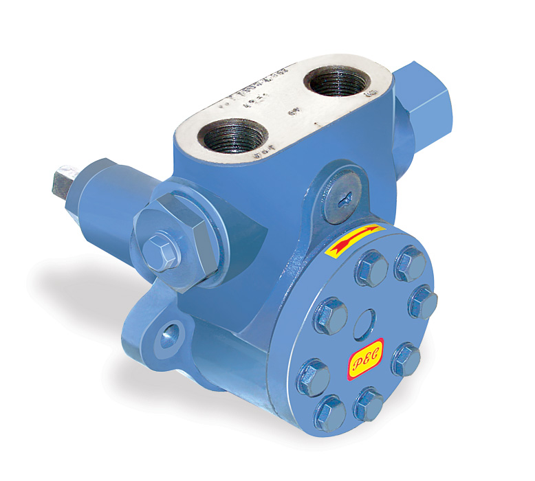 Gear pump uses two rotating gears which un-mesh at the suction side of the pump to create voids which allow atmospheric pressure to force fluid into the pump. The spaces between the gear teeth transport the fluid on either side of a crescent to the discharge side, and then the gears re-mesh to discharge the fluid. Our gear design has an outer drive gear (rotor- shown in orange) which turns the inner, driven gear.